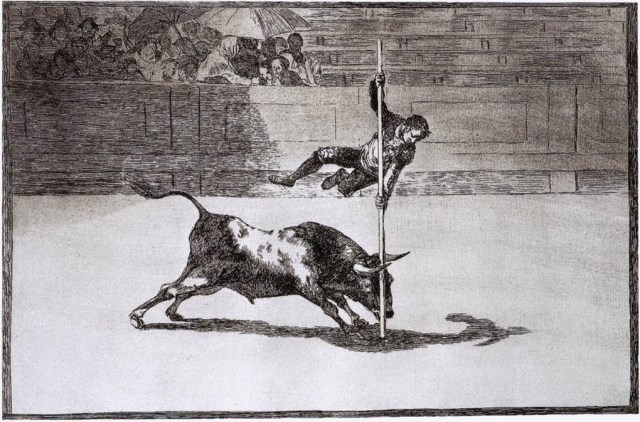 11.- Saltarse algo “a la torera”: es cumplir la voluntad propia sin importar las condiciones ni opiniones de los demás. También puede significar soslayar una obligación o compromiso. Pero, ¿De dónde viene esta expresión? Entre los antecedentes de las corridas de toros, se encuentra el de los saltos de toro (supongo que es algo similar a lo que hoy conocemos como el salto del potro). ¿Qué era eso? Se trataba de citar al toro y saltar por encima de él, burlándolo cuando éste intentaba envestir al torero. El torero saltaba sobre él, normalmente apoyando las manos sobre su lomo, sobre la testa o con ayuda de una pértiga. Muchas de estas prácticas aparecen ilustradas en los grabados de Goya dedicados a la tauromaquia. La idea de esquivar libremente al toro, sin normas ni maneras se trasladó al ámbito de los deberes y las obligaciones, y de ahí proviene esta expresión.