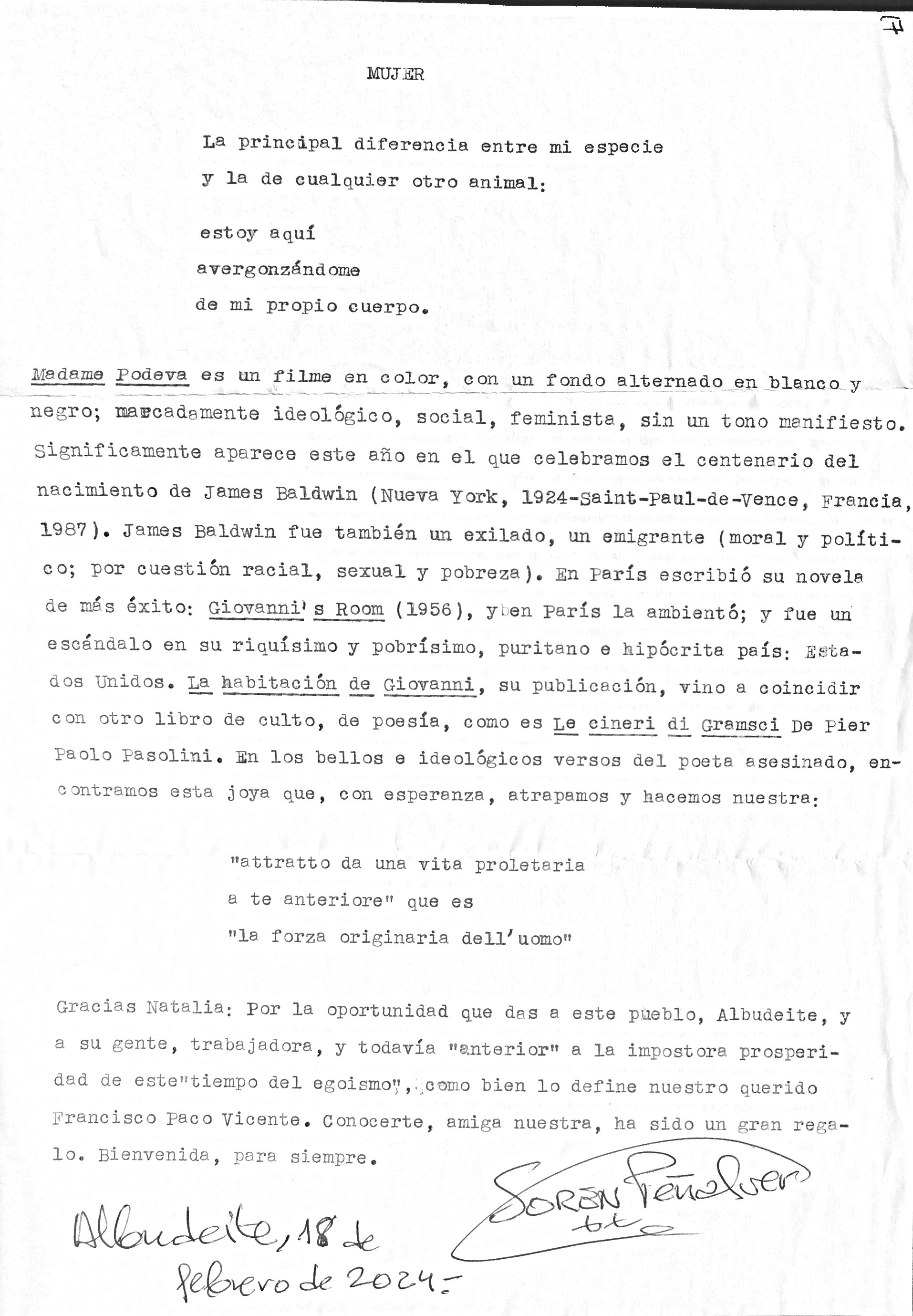 – La poeta Carolina Bustos Beltrán en su texto, Carta a Madame Podeva, Julio 2024: